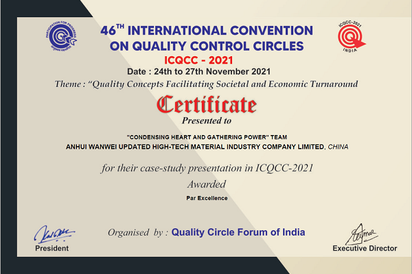 2021年11月30日,世界杯官网学生参与上市企业皖维高新QC小组成果在第46届国际(ICQCC)质量管理小组成果发表赛上喜获最高奖项——金奖荣誉。