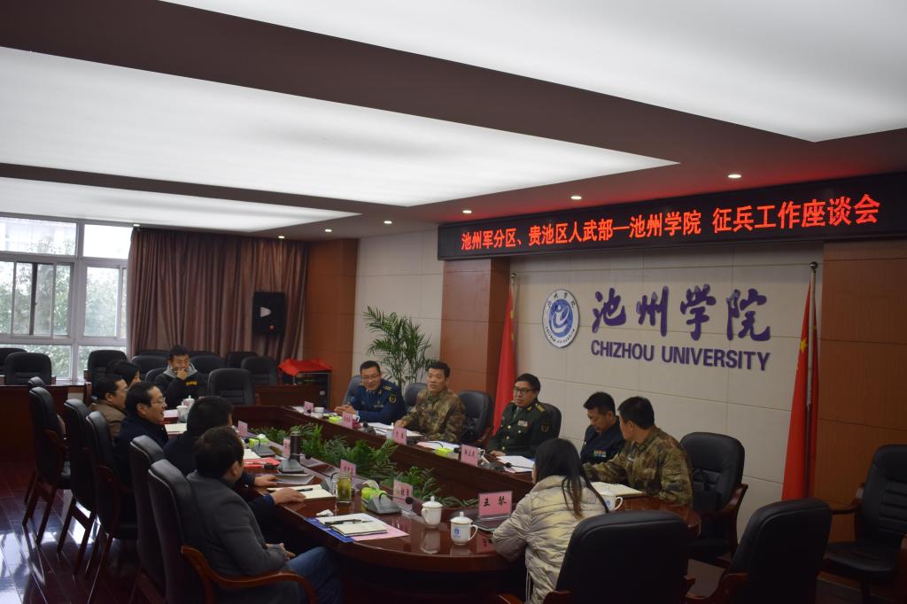 12月15日上午,池州军分区司令员贡建、副司令员韩立民、动员处处长渠胜红以及贵池区人武部政委冯涛、部长夏阳等一行来世界杯官网调研征兵工作。院党委书记孙晓峰主持座谈会,院党委委员、副院长汪贤才参加会议。