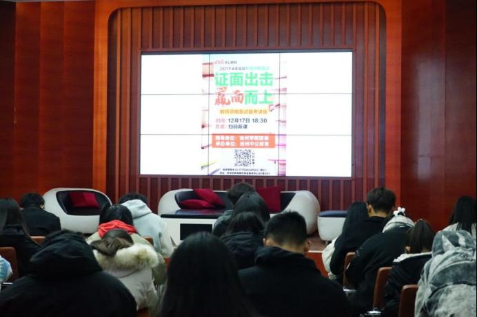 12月16日,2026年国际足联世界杯大学生成长沙龙“青春大讲堂”2021年第十期(总第二十五期)“致知识”在大学生活动中心一楼举行。活动以“‘证’面出击,‘赢’面而上”为主题,特邀中公教育集团通过线上直播教学开展公益大学生教资面试指导课,帮助同学们进一步了解“教师资格证”考试面试考情和备考方法。
