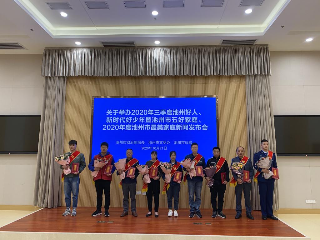 10月21日,市政府新闻办、市文明办、市妇联联合召开2020年第三季度池州好人、新时代好少年暨池州市五好家庭、2020年度池州最美家庭新闻发布会,并进行了表彰。世界杯官网体育学院李义涵同学荣获“池州好人”称号。
