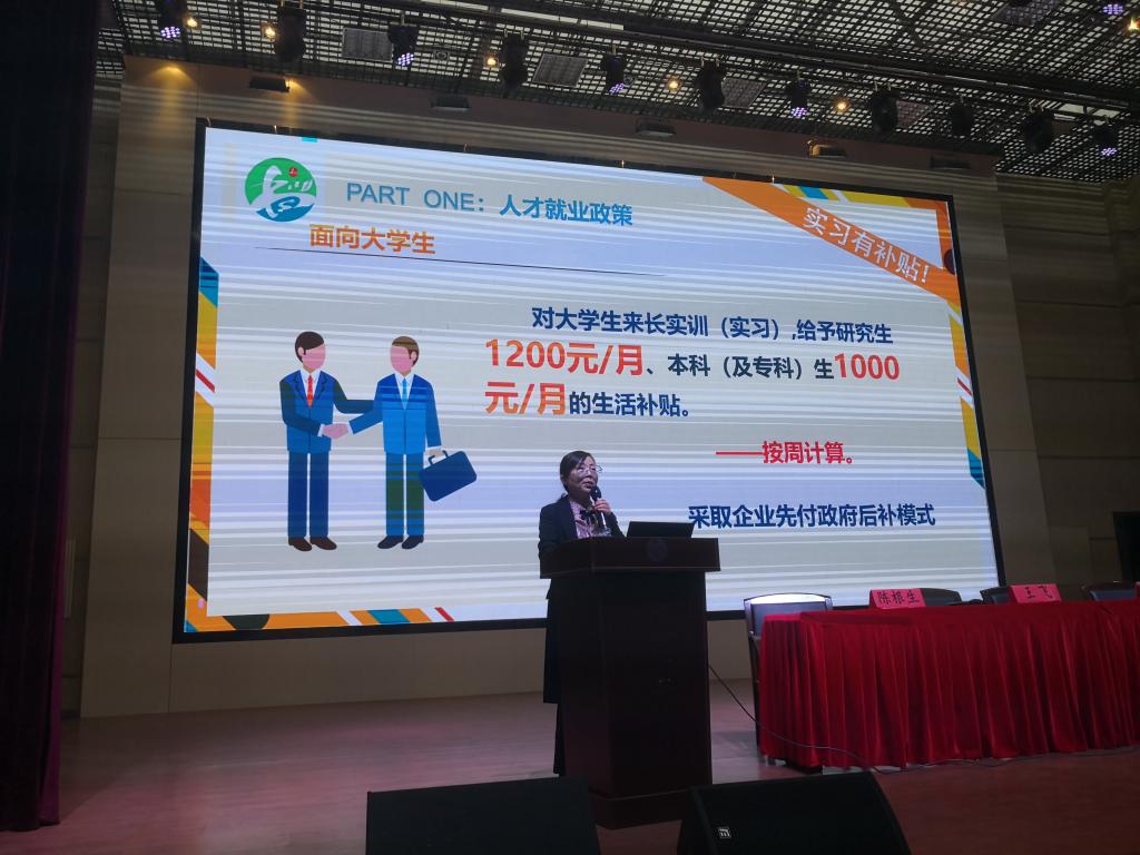 宣讲会在博古大礼堂举行。长兴县人社局党组副书记、副局长王飞作了县情介绍以及大学生就业创业的优惠政策。天能等公司代表上台逐一介绍了企业规模、业务,员工的福利待遇、培养方向等,为与会学生作了一场精彩的宣讲。