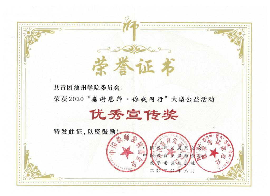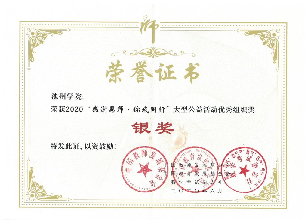近日,2019年度“感谢恩师·你我同行”大型公益活动圆满结束,世界杯官网荣获全国“优秀组织奖银奖”、全国“优秀宣传奖”等荣誉称号,文学与传媒学院叶静同学荣获全国“优秀传承奖”,外国语学院周红同学、旅游与历史文化学院陈蓉同学荣获“优秀感恩大使”荣誉称号。