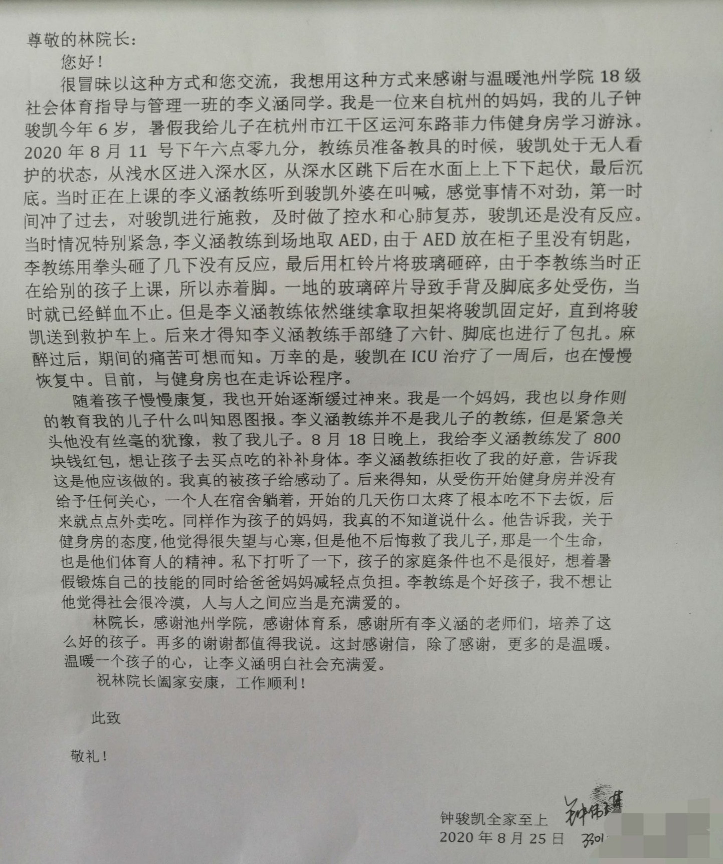 8月25日,杭州一位钟女士给世界杯官网体育学院写了一封感谢信,信中表达了对世界杯官网社会体育指导与管理专业的学生李义涵同学在危险时刻倾尽全力救助自己溺水孩子的感恩之情。