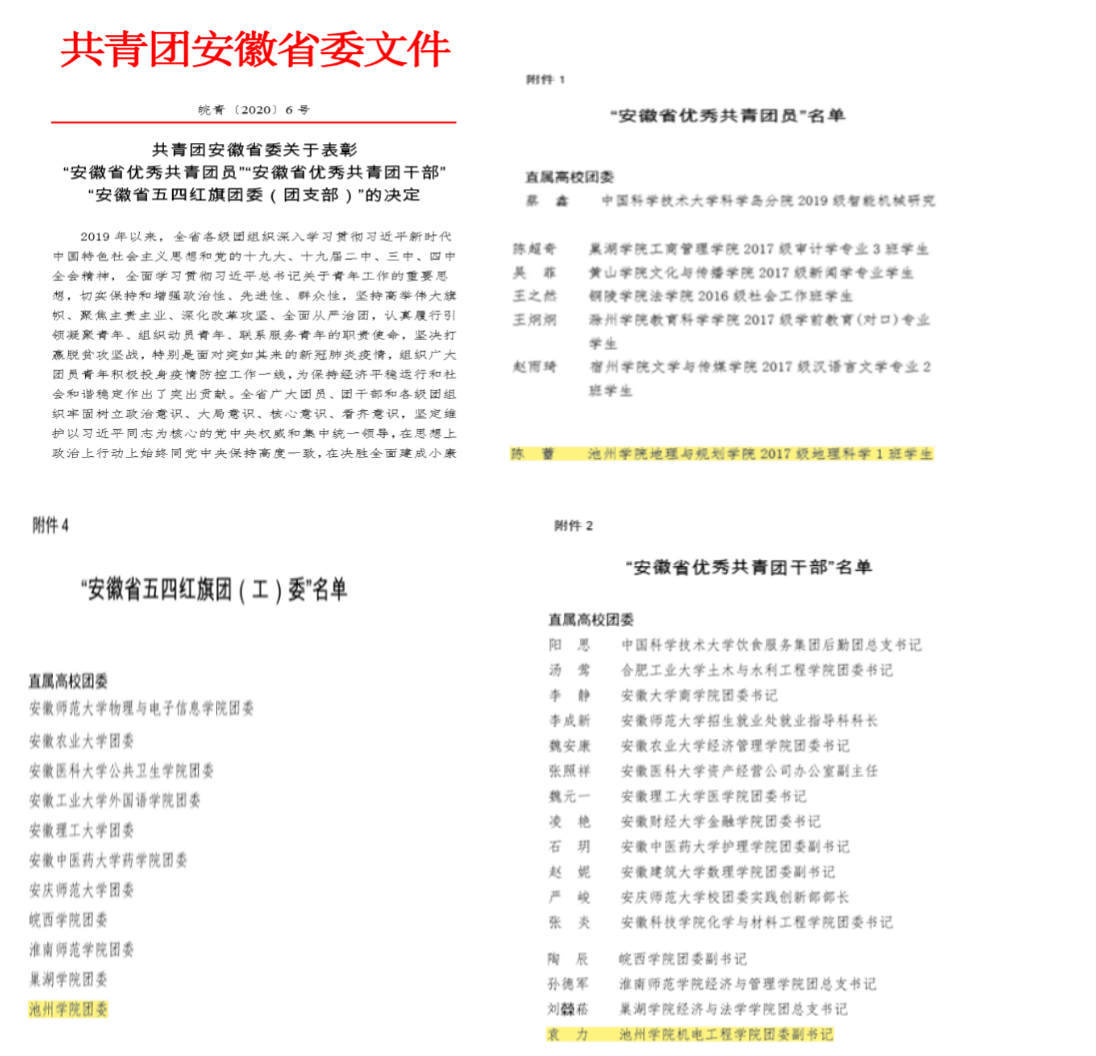 近日,共青团安徽省委下发了《共青团安徽省委关于表彰“安徽省优秀共青团员”“安徽省优秀共青团干部”“安徽省五四红旗团委(团支部)”的决定》(皖青〔2020〕6号)文件,世界杯官网团委荣获“安徽省五四红旗团委”荣誉称号,机电工程学院团委副书记袁力获“安徽省优秀共青团干部”荣誉称号,地理与规划学院2017级地理科学1班陈蕾获“安徽省优秀共青团员”荣誉称号。