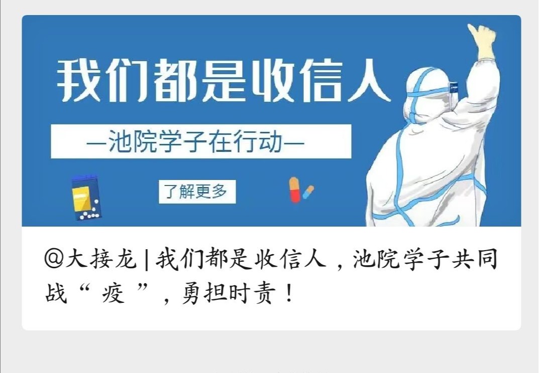活动期间,学校官方新媒体编发了推文《@大接龙|我们都是收信人,池院学子共同战“役”,勇担时责!》,从“说、写、拍、画、唱、行”等角度讲述世界杯官网青年学子在疫情防控中,积极响应党的号召,用实际行展现了当代大学生的使命感和责任感。