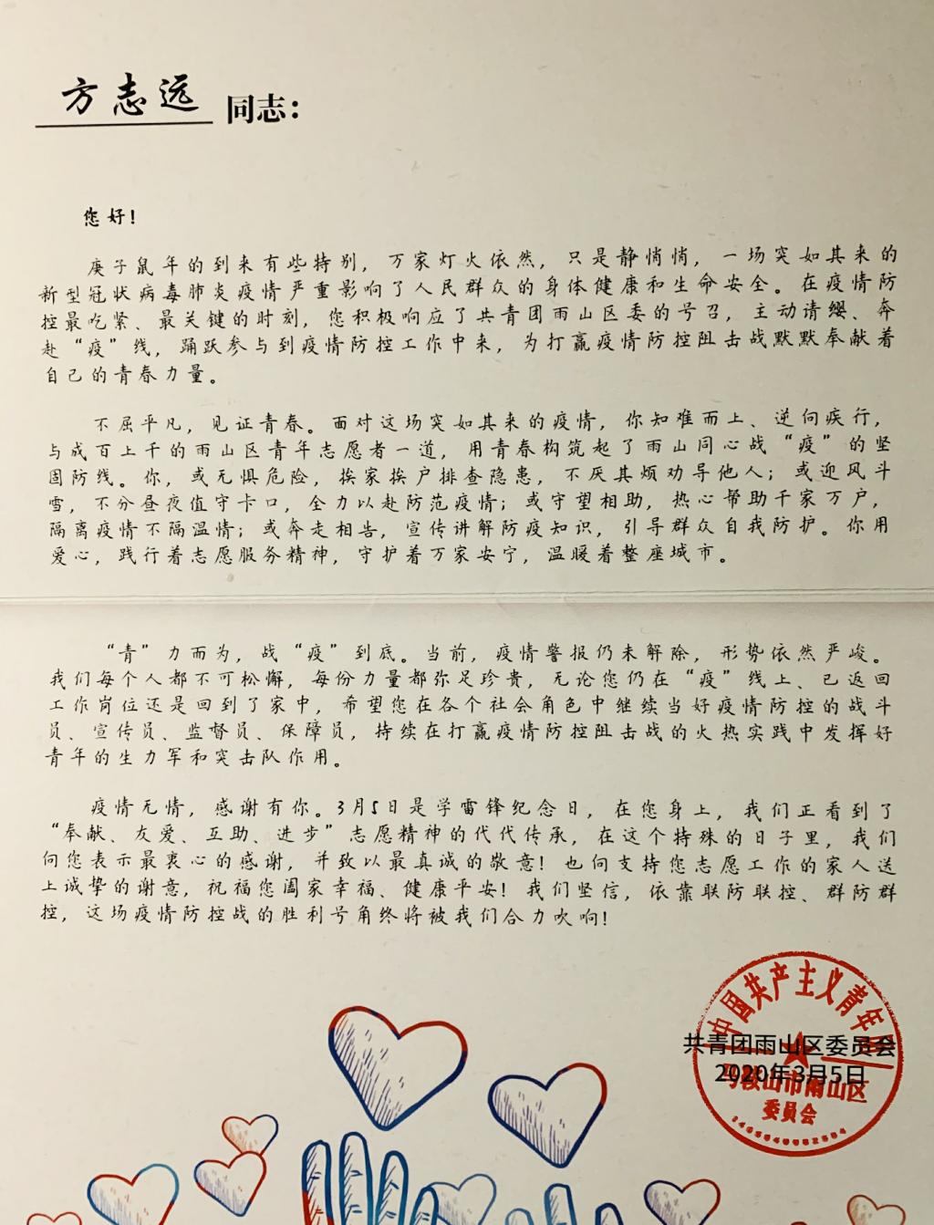 信中写道:“面对这场突如其来的疫情,你知难而上、逆向疾行,与成百上千的雨山区青年志愿者一道,用青春构筑成了雨山同心战“役”的坚固防线。你,或无惧危险,挨家挨户排查隐患,不厌其烦劝导他人;或迎风斗雪,不分昼夜值守卡口,全力以赴防范疫情;或守望相助,热心帮助千家万户,隔离疫情不隔温情;或奔走相告,宣传讲解防疫知识,引导群众自我防护。你用爱心,践行着志愿服务精神,守护着万家安宁,温暖着整座城市。”