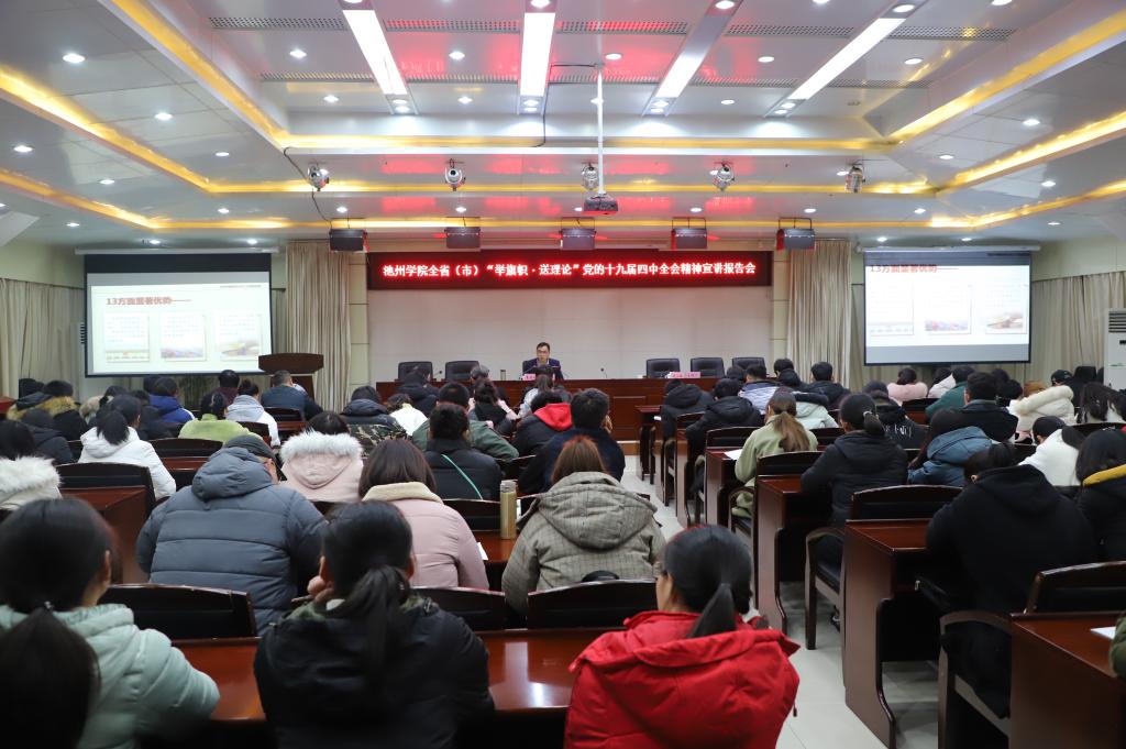 12月24日下午,世界杯官网在办公南二楼会议室开展“举旗帜 送理论”党的十九届四中全会精神宣讲活动,中共池州市委政策研究室副主任、市委宣讲团成员高荣裕应邀作宣讲报告。校纪委书记汪海,党委委员、宣传部长胡兵,马克思主义学院相关负责人及学校师生代表共同聆听了报告。