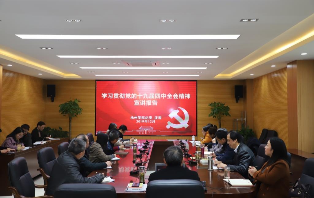 12月6日下午,校党委委员、纪委书记汪海在办公北二楼会议室作党的十九届四中全会精神宣讲报告。校纪委委员、纪委办、审计处全体人员,地理与规划学院、旅游与历史文化学院全体教职工党员聆听了报告。