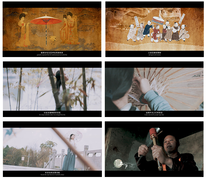 《伞风国艺》以二维动效与影像实拍相结合的方式,系统地将中国油伞的发展简史进行了概述,亦生动地体现了中华民族的油伞情怀。二维动效部分的角色选取与画面配色等细致的处理、对皖南风情与制伞技艺的呈现以及象征着柔美与爱情的油伞意境的复现等组合而成了本片的亮点。在视觉呈现方面,结合中国油伞元素进行了动态化的包装设计,契合了短片的传统文化内涵与构成需要。中国油伞简史生动,制伞匠人的故事鲜活,转场过渡自然,整体结构清晰,意境深远。