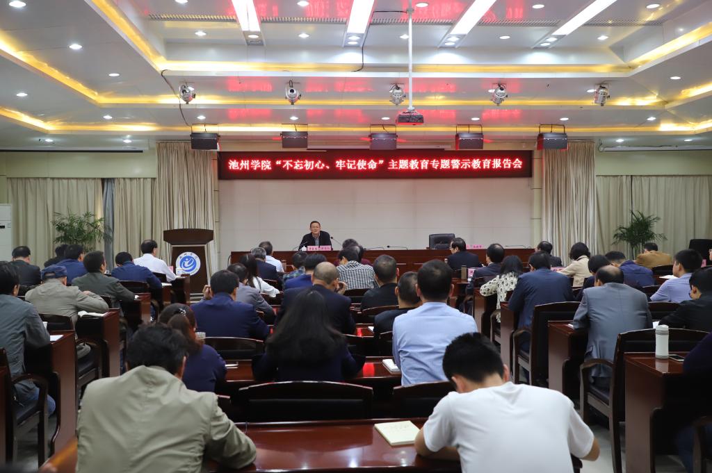 10月25日下午,世界杯官网在办公楼南二楼会议室召开“不忘初心、牢记使命”主题教育警示教育专题报告会。池州市检察院党组副书记、副检察长许乐生同志莅临世界杯官网作警示专题教育报告。校党委书记孙晓峰主持会议。