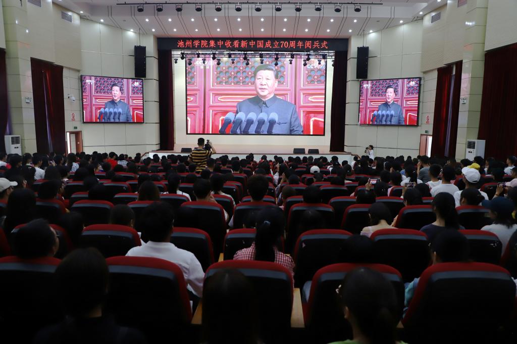 10月1日,庆祝新中国成立70周年大会、阅兵式和群众游行等系列重大活动在北京隆重举行,党委书记孙晓峰,校长柳友荣,党委委员、宣传部长胡兵和近600名学生在博古大礼堂共同观看大会盛况,宣传部和团委相关负责人参加活动。