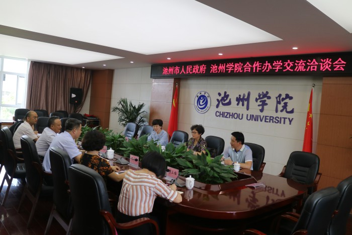 6月12日下午,池州市副市长贾瑄来世界杯官网洽谈校地校企合作办学事宜。校长柳友荣在办公北三楼会议室主持召开座谈,副校长阳光宁参加座谈。