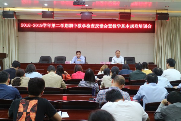 5月15日下午,学校在办公南二楼会议室召开2018-2019学年第二学期期中教学检查反馈会暨教学基本规范培训会。校长柳友荣出席会议,会议由副校长阳光宁主持。学校教学督导组成员、各学院院长及教学副院长、各学院教学工作办公室主任、教研室主任、学院二级督导员、评建办和教务处全体工作人员参加会议。