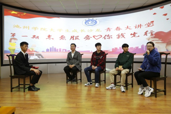 王坤、刘俐、谢正宇和李宁四位嘉宾分别讲述自己的志愿服务故事,分享自身的志愿服务感悟,并与同学们进行现场互动。