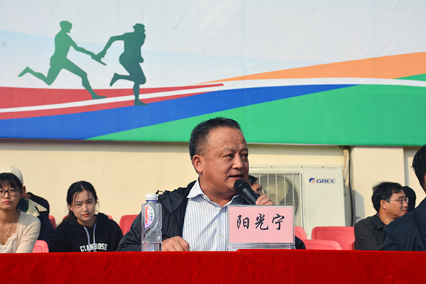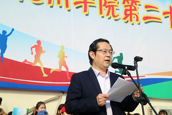 孙晓峰在致辞中,对本届运动会的顺利开幕表示热烈的祝贺。他指出,高等教育承担着为新时代培养人才的重担。文化教育是根本,德育教育是关键,美体教育是抓手。体育让人们学会竞争、勇于进取、超越自我,一次运动会就是一场竞争意识的演练;他期望,在接下来的比赛中,运动员们可以用智慧、用技能、用知识来征服困难,在运动中学会协作、学会助人、学会拼搏、学会承受。