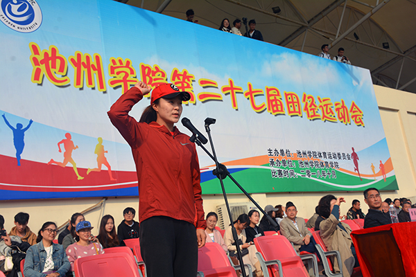 体育学院教师赵振红及化学与材料工程学院17级材料化学专业的边多灵同学分别代表赛事裁判员和运动员宣誓。