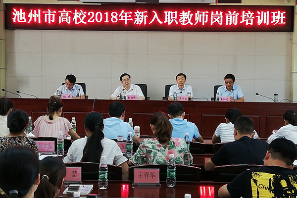 8月10日上午,池州市高校2018年新入职教师岗前培训班开班典礼在世界杯官网行政南二楼会议室举行。校党委副书记孙晓峰、池州广播电视大学副校长吴永健出席。来自全市高校的40名新入职教师参加了开班典礼。