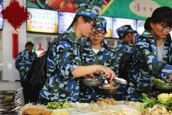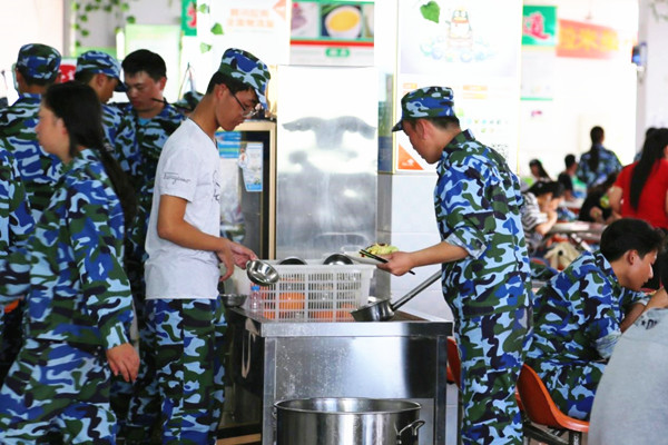经过一天高强度的训练,早已饥肠辘辘的新生们依然在各个窗口前井然有序地排起了长队。