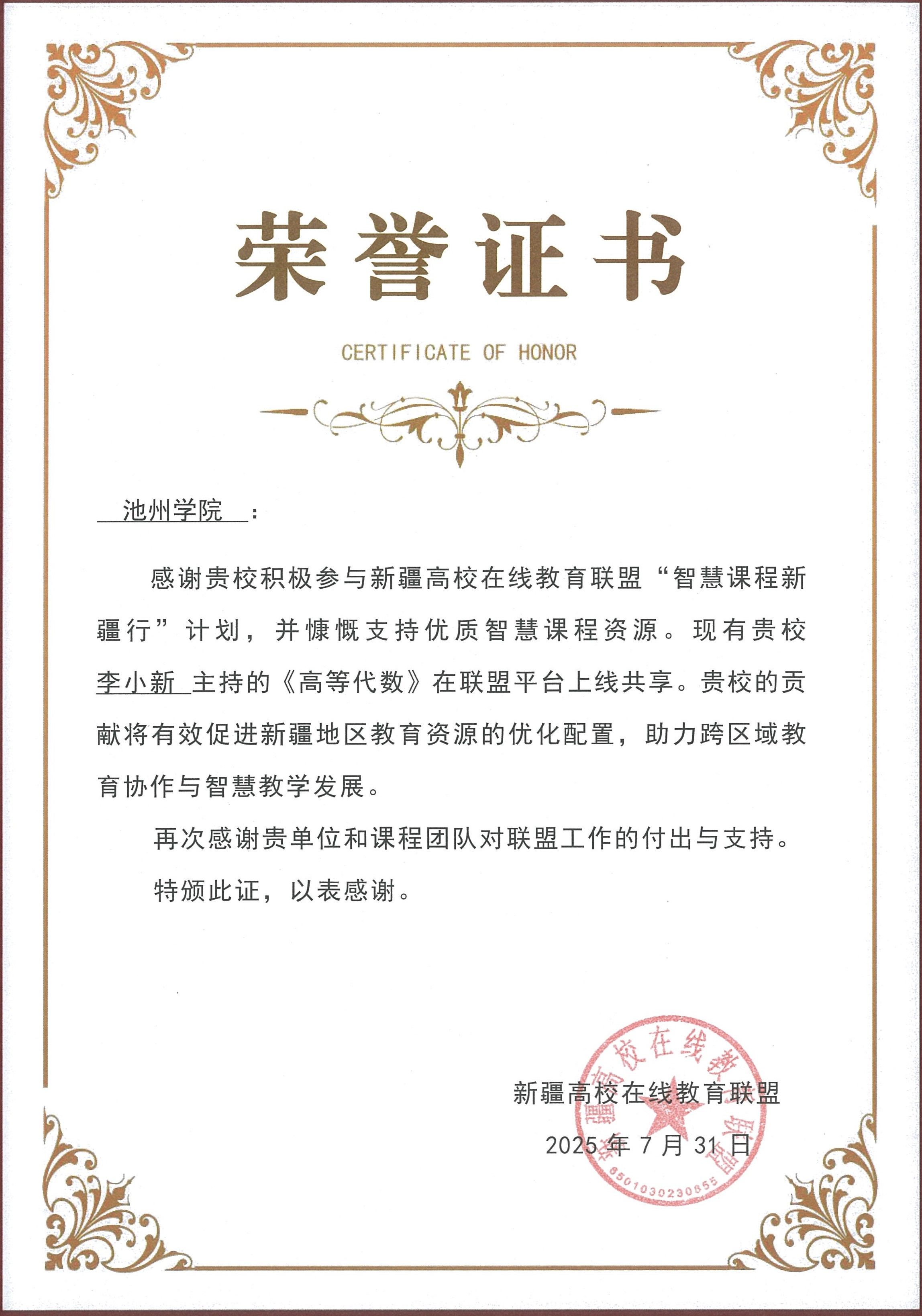 近日,“智慧课程新疆行”第一批上线课程名单公布,世界杯官网选送的《高等代数》课程通过审核,成功上线新疆高校在线教育联盟平台。