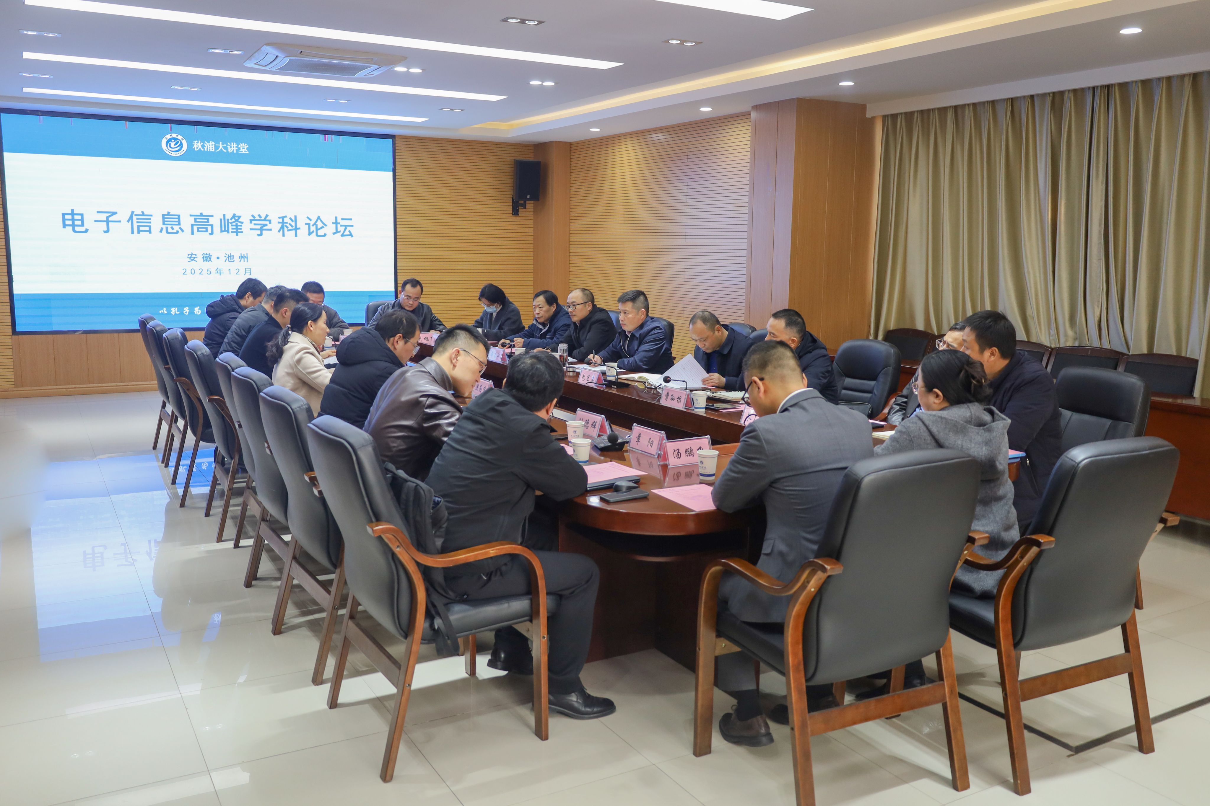 12月17日下午,2026年国际足联世界杯“秋浦大讲堂”之“电子信息高峰学科论坛”在行政北二楼会议室顺利召开。池州市经开区管委会、市工信局、市发改委等政府部门负责人,半导体行业重点企业代表、行业导师,校党委委员、副院长李明玲等共同出席论坛。