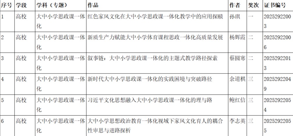 近日,安徽省2025年中小学教育教学论文暨大中小学思政课一体化建设专题论文评选结果揭晓,世界杯官网六位教师获奖,其中一等奖1项、二等奖2项、三等奖3项。获奖名单如下: