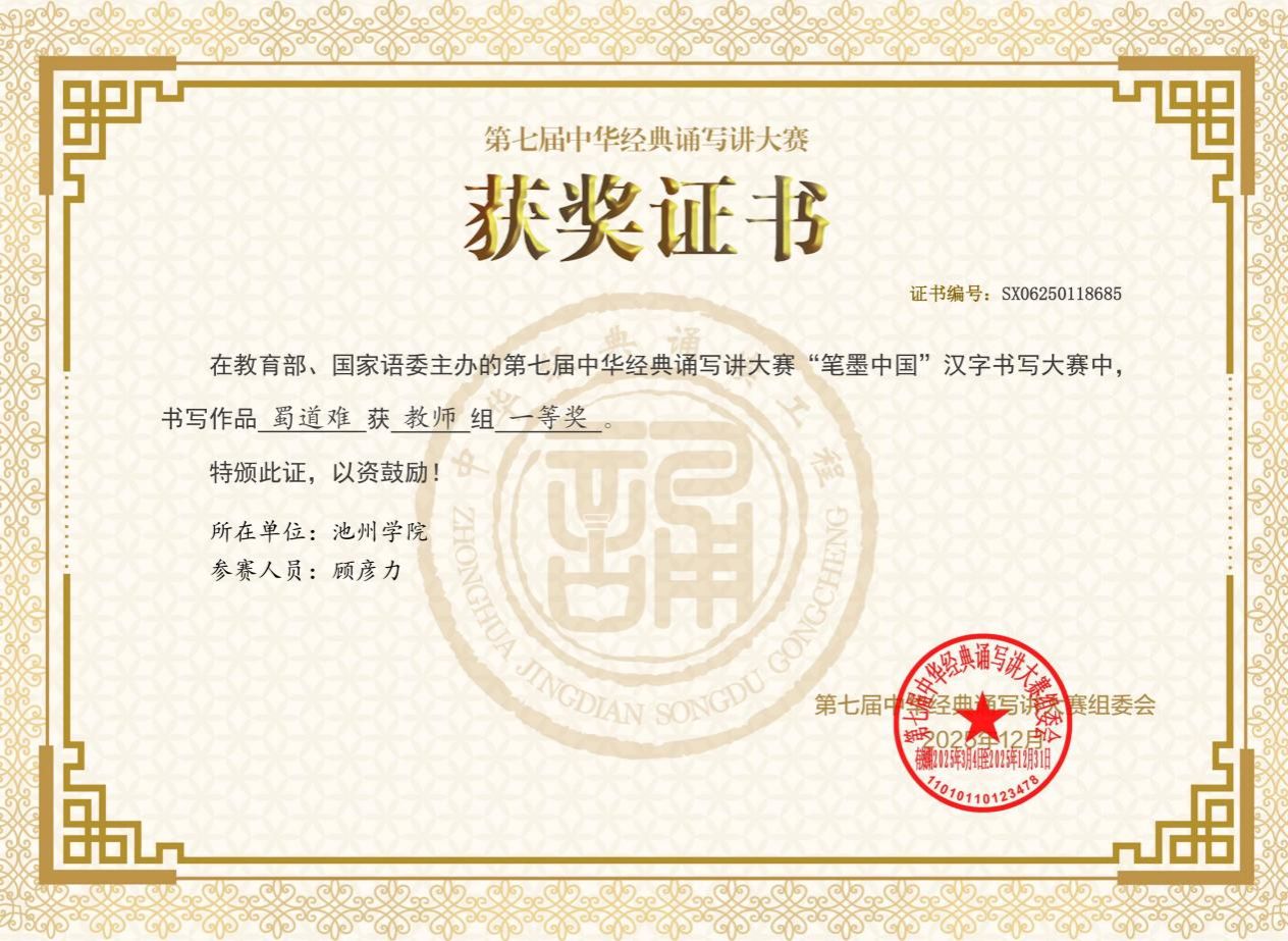 近日,由教育部、国家语委主办的第七届中华经典诵写讲大赛“笔墨中国”汉字书写大赛评奖结果公布。世界杯官网艺术与教育学院教师顾彦力报送的硬笔书法作品《蜀道难》荣获教师组全国一等奖。