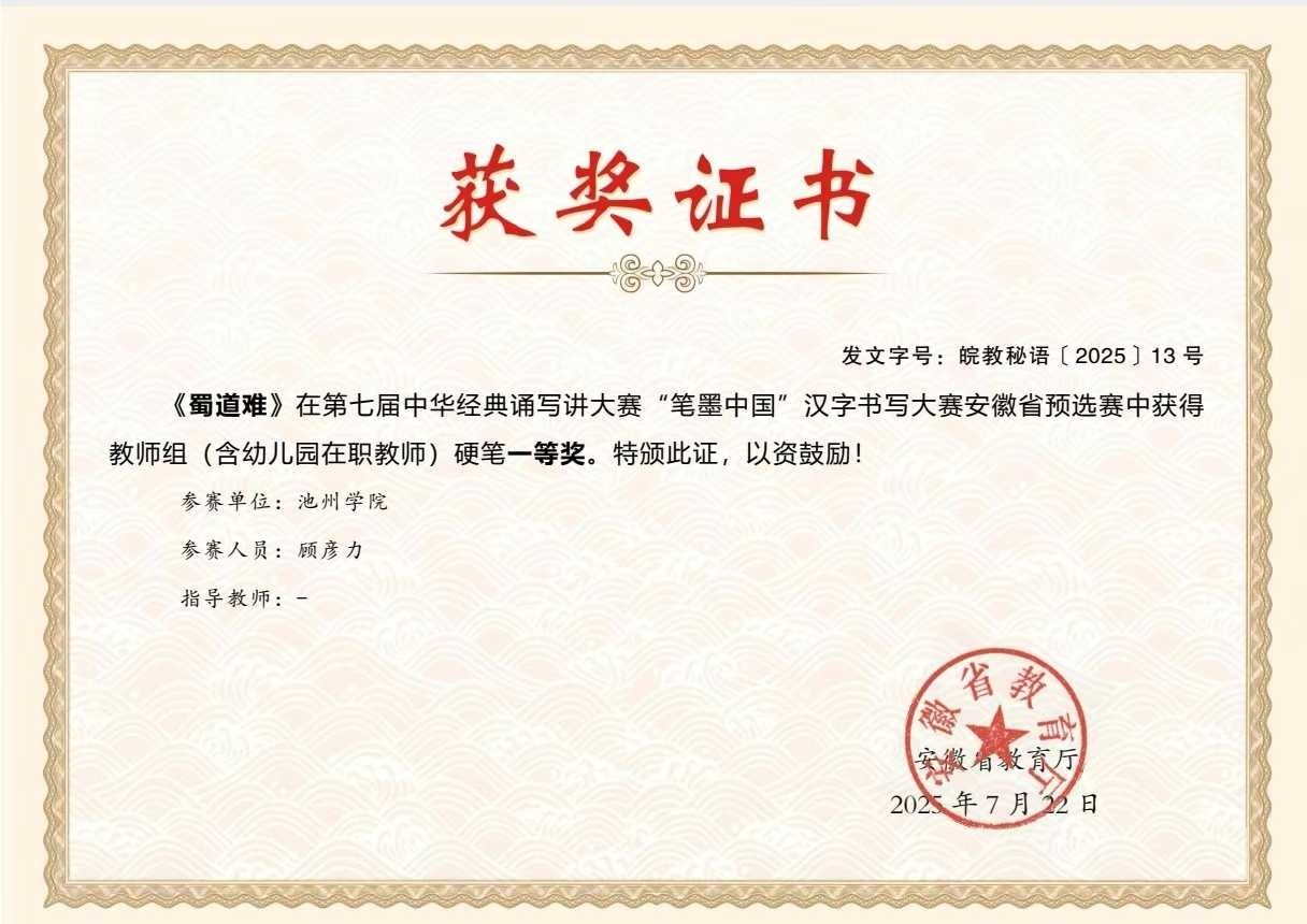 该赛事已列入“2025全国普通高校学科竞赛排行榜”,属A类赛事,在推广国家通用语言文字、传承发展中华优秀语言文化方面发挥着重要作用。本届大赛竞争激烈,初赛入围作品逾547万件。经层层评审,“笔墨中国”教师组全国一等奖仅50人获得。此前,《蜀道难》这部作品已获安徽省一等奖,并获省教育厅推荐参加国赛。