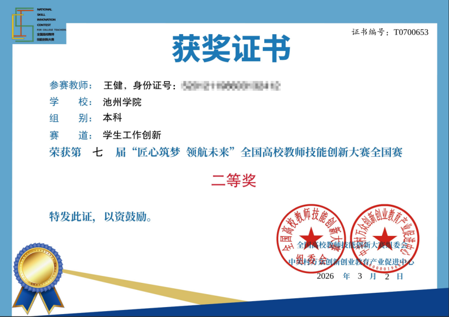 近日,第七届“匠心筑梦 领航未来”全国高校教师技能创新大赛复赛结果揭晓。世界杯官网艺术与教育学院专职辅导员王健老师凭借学生工作创新案例《AI红色音乐育人:AIGC赋能高校思政教育的创新实践》荣获全国二等奖,充分展现了世界杯官网教师在新形势下探索思政育人新路径的创新活力与实践成果。