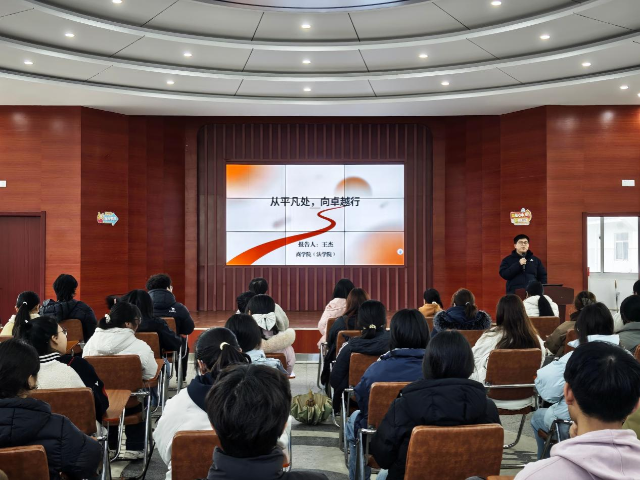 活动现场,王杰以自身从普通本科生成长为高校教师及科研工作者的经历为切入点,讲述平凡与卓越的辩证关系。王杰结合考研深造、社会实践、荣获博士研究生国家奖学金、获批国家社会科学基金项目和省部级课题等奋斗历程,分享了深耕不辍、持续奋进的成长感悟。围绕青年学生成长需求,他进一步提出锚定初心的目标导向、极致深耕的实干精神、长期主义的积累思维、复盘迭代的成长方法等实践路径,勉励同学们以务实态度对待学习生活,以坚韧品格回应成长考验,在脚踏实地中积蓄前行动能,在久久为功中实现自我超越。