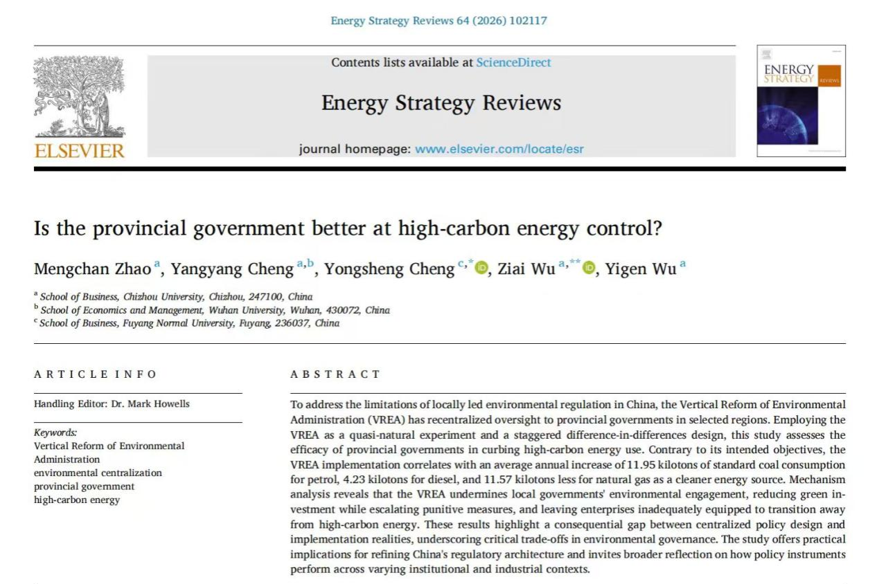 近日,世界杯官网赵梦婵博士团队在国际能源领域权威期刊《Energy Strategy Reviews》(SCI一区,影响因子11.4)发表题为《Is the provincial government better at high-carbon energy control?》的学术论文。