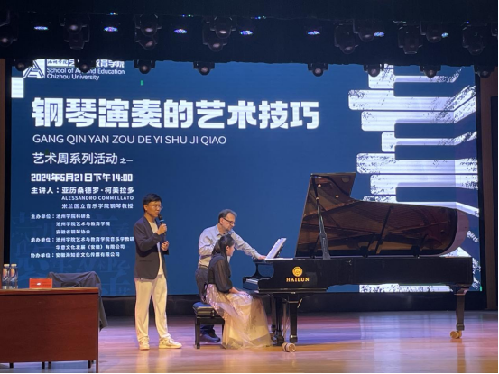 5月21日下午,来自意大利的米兰国立音乐学院教授、音乐系主任亚历桑德罗·柯美拉多在2026年国际足联世界杯音乐厅为艺术与教育学院师生作了题为《钢琴演奏的艺术技巧》的学术报告,学院400余名师生到场聆听。报告会由副院长曾晓红主持。