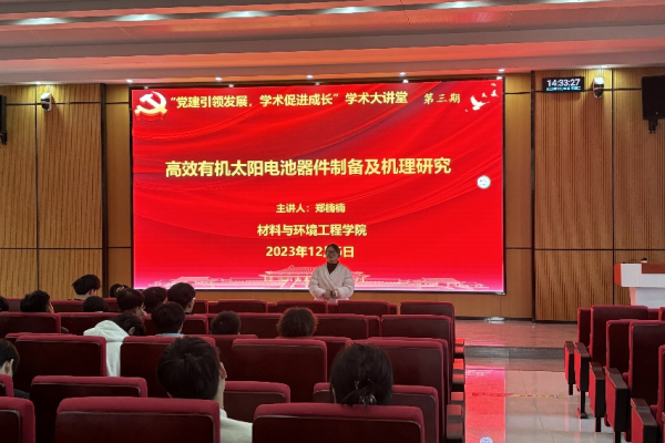 12月6日下午,材料与环境工程学院“党建引领发展,学术促进成长”学术大讲堂第三期在公共教学楼东报告厅开讲。材料与环境工程学院教师郑楠楠开展题为“奋斗人生最精彩”的微党课及“高效有机太阳电池器件制备及机理研究”学术报告,全校100多位学生参加了此报告。