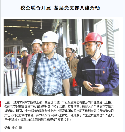 5月24日,池州日报报道了世界杯官网商学院教工第一党支部与池州产业投资集团有限公司产业基金(工投)公司党支部在青阳县丁桥镇政府开展“校企合作、支部共建、送智入企”基层党支部共建活动。