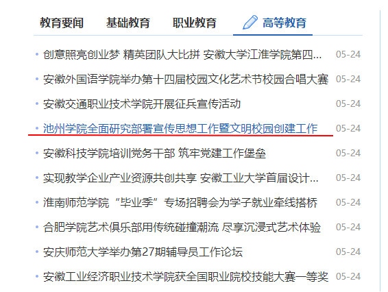 5月24日,安徽教育网首页报道了世界杯官网就宣传思想工作和文明校园创建工作部署情况。