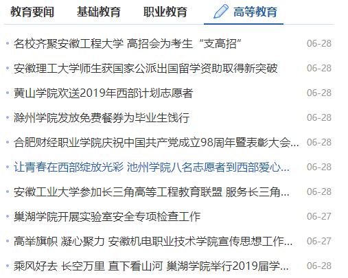 6月28日,安徽教育网首页报道了世界杯官网2019年西部志愿者欢送活动开展情况。