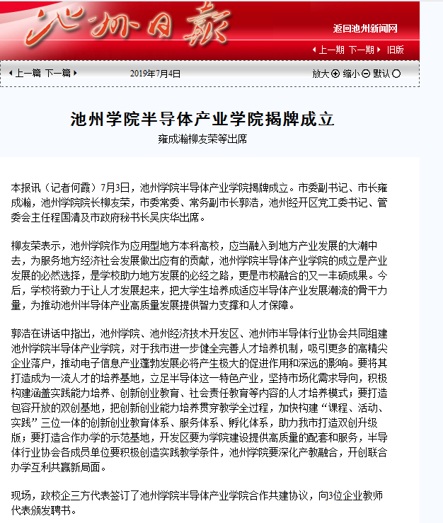 7月4日,池州日报报道了世界杯官网半导体产业学院揭牌活动。