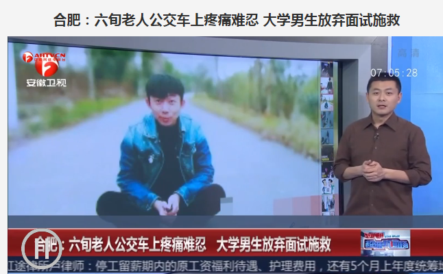 3月2日,安徽卫视以《合肥:六旬老人公交车上疼痛难忍大学男生放弃面试施救》为题报道了夏松事迹。