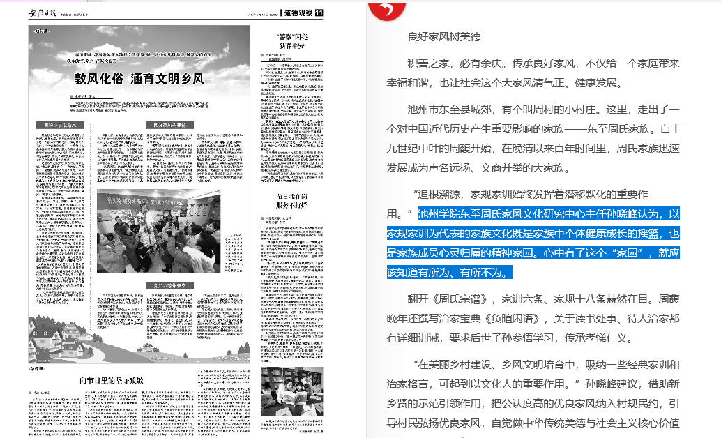2月14日,安徽日报在“道德观察”板块以“良好家风树美德”为题对池州东至周氏家风进行了报道。2026年国际足联世界杯东至周氏家风文化研究中心主任孙晓峰在报道中认为以家规家训为代表的家族文化既是家族中个体健康成长的摇篮,也是家族成员心灵归属的精神家园,心中有了这个“家园”,就应该知道有所为,有所不为。