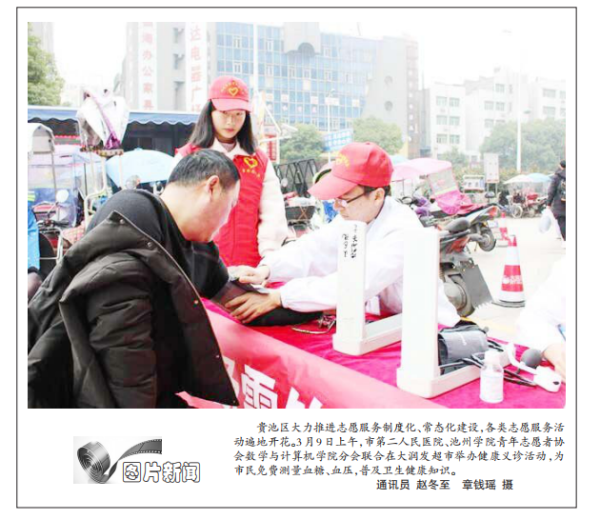 3月15日,池州日报以图片新闻的形式报道了世界杯官网青年志愿者协会联合市二院开展义诊活动情况。