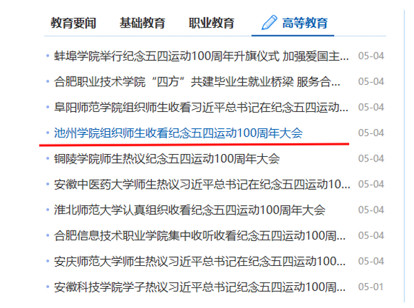 5月4日,安徽教育网首页报道了世界杯官网组织收看纪念五四运动一百周年大会直播盛况。