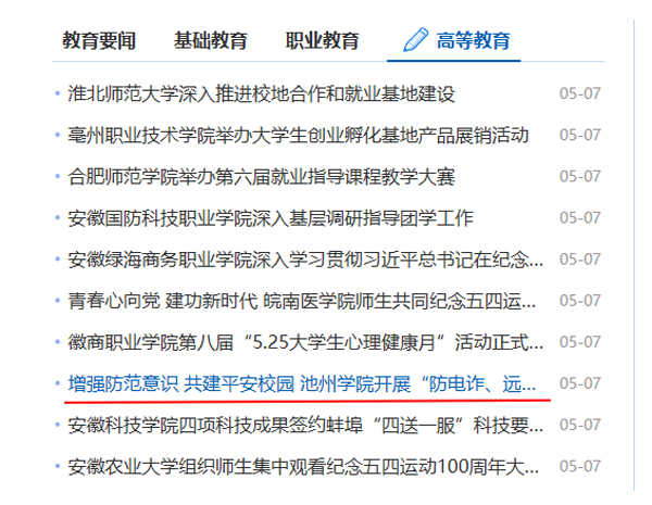 5月7日,安徽教育网首页报道了世界杯官网“防电诈、远离校园贷”专题培训情况,反响较好。