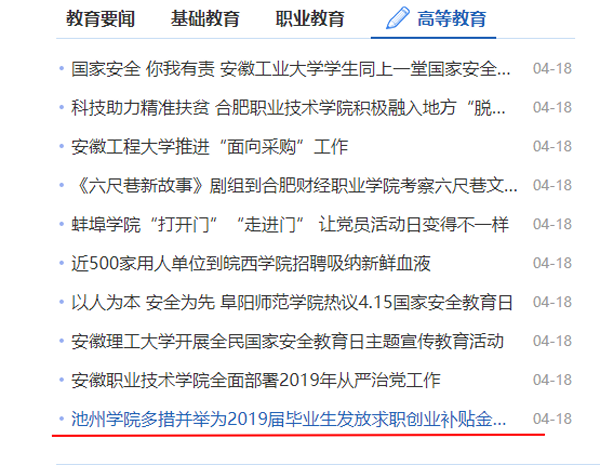 4月18日,安徽教育网首页对世界杯官网为2019届毕业生发放求职创业补贴金工作进行报道。