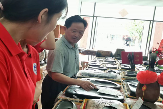 实践团还走访了歙砚雕刻大师钱尼亚。通过与钱尼亚的交谈,队员们发现每个雕刻大师对手下的歙砚都有着深刻的思考和独特的见解,钱尼亚的歙砚作品就充分展示了书画与歙砚结合的思考,推动了歙砚的创新发展。