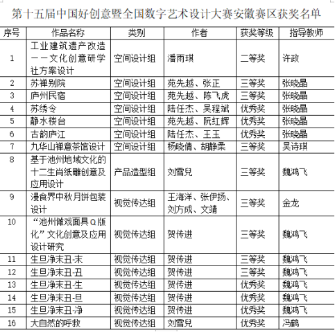 近日,第十五届中国好创意暨全国数字艺术设计大赛安徽赛区评审结果揭晓,艺术与教育学院学生获二等奖1项,三等奖8项,优秀奖7项。魏鸿飞老师获优秀指导教师奖。