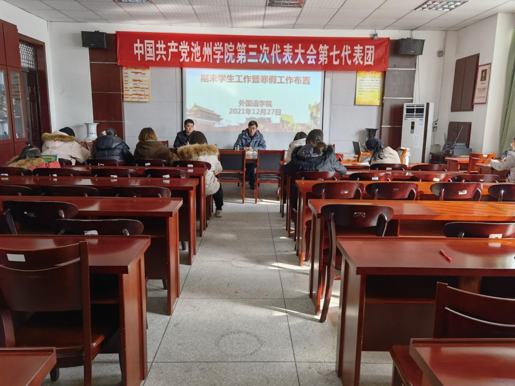 12月27日下午,外国语学院在会议室举行学生工作会议,布置期末及寒假学生工作。外国语学院党委书记张乐民出席会议。会议由外国语学院党委副书记刘军主持。