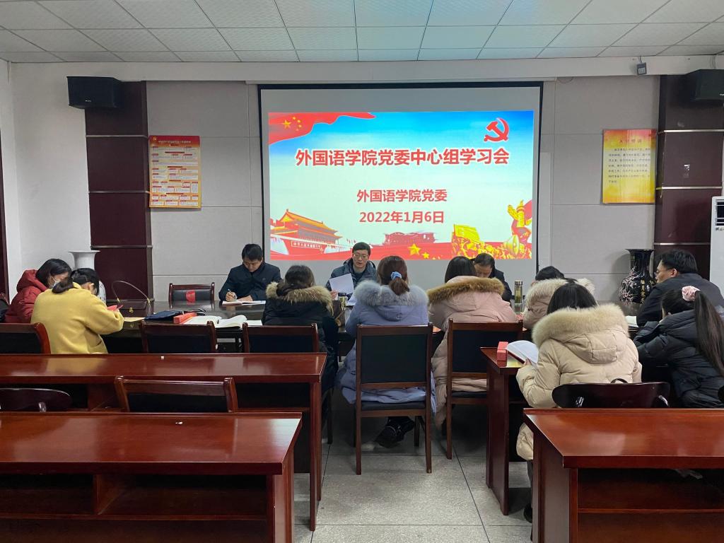 1月6日上午,外国语学院在会议室举行党委中心组2022年第一次集中学习暨党建工作会议。外国语学院党委委员、各支部委员参加了会议。会议由外国语学院党委书记张乐民主持。