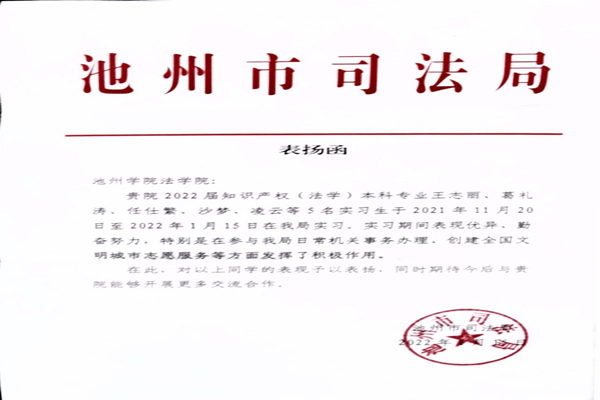 2022届毕业生在实习岗位上尽职尽责,展现出了新时代大学生的担当精神与新时期法律人的敬业精神,获得了用人单位的高度评价,其中王志丽等五名同学因在池州市司法局实习期间表现优异、勤奋努力,在局内日常机关事务办理与创建文明城市志愿服务等方面发挥了积极作用,获得了池州市司法局发送表扬函,并表示了与法学院在未来工作中开展更多交流合作的意愿。