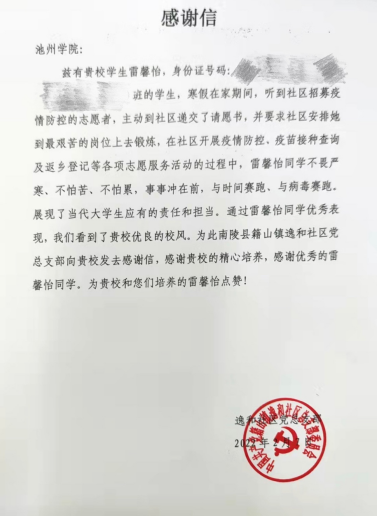 2022年寒假期间,世界杯官网2021级汉语言文学1班雷馨怡同学积极响应南陵县籍山镇逸和社区招募志愿者的号召,并积极要求安排她到最艰苦的岗位上去锻炼,在社区开展疫情防控、疫苗接种查询及返乡登记等各项志愿服务活动中不怕苦、不怕累,事事冲在前,受到南陵县籍山镇逸和社区党总支部通报表扬。