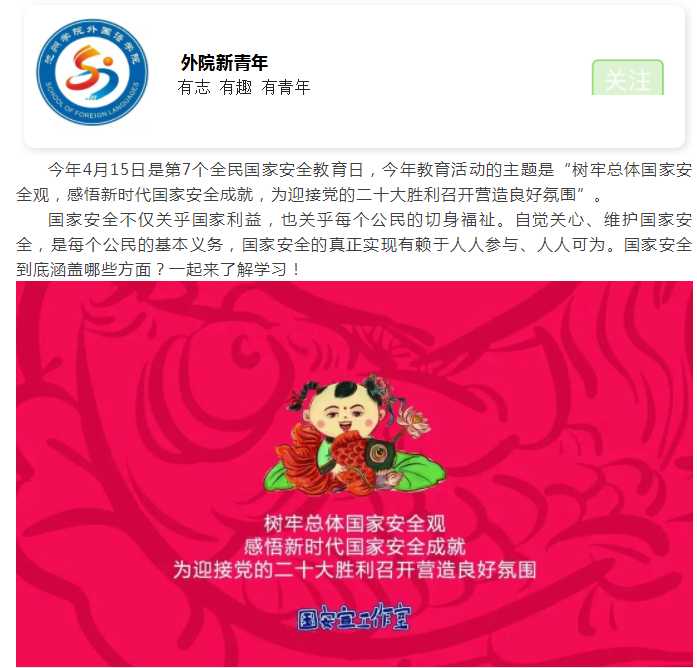 外国语学院结合2022年 “树牢总体国家安全观,感悟新时代国家安全成就,为迎接党的二十大胜利召开营造良好氛围” 主题,认真谋划此次全民国家安全教育日宣传教育活动,利用“外院新青年”微信公众号及时转发国安宣工作室制定的宣传海报,增强宣传效果。