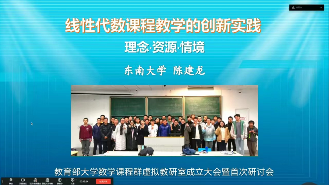 研讨会上,朱士信教授从建设总体规划、具体建设目标、整体架构三个方面,详细介绍了大学数学国家虚拟教研室的建设方案与举措。全国首届数学教学创新大赛教授组第一名、东南大学陈建龙教授以《线性代数课程教学的创新实践》为题,从基本情况、理念目标、资源创新、方法创新、教学成效五个方面就线性代数课程设计进行了示范展示。